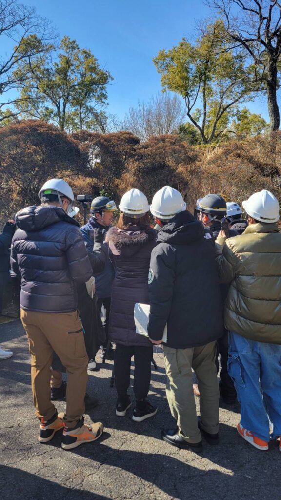 今回は、ドローンで建物の壁面を点検する手法を10名の参加者に実施いたしました。愛知県犬山市の学校施設のご協力をいただき、タイル張り壁面の校舎の一部を赤外線画像と、可視画像で撮影し、その画像を用いて分析する手順とスキルを学びました。