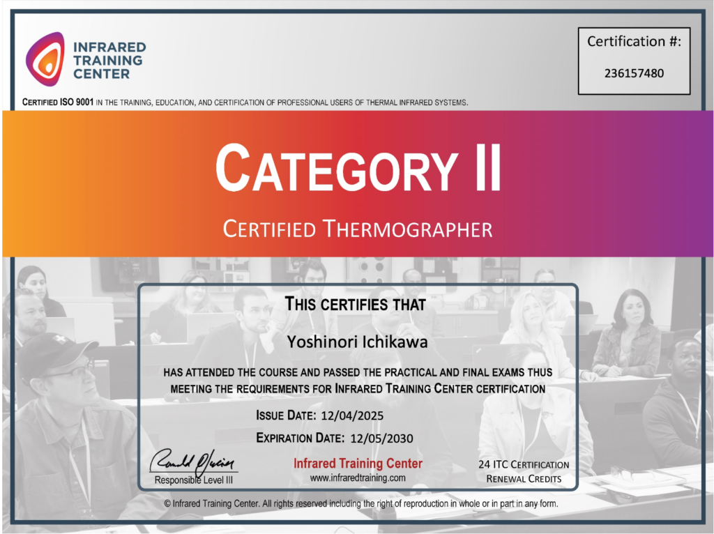 この度、弊社は、赤外線サーモグラフィの国際的な専門機関であるInfrared Training Center (ITC) のレベル2認定を取得いたしました。